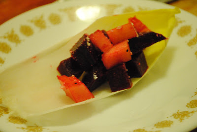 I ripped the roots off the greens and put them to boil for 20 minutes. I like to peel the skin off with my hands under cold water; it feels, primal. After boiling, the skin will come right off; this leaves your hands looking as if you just did something grizzly. (Think shower scene from Psycho.) I diced up the beets and cucumber and ran under cold water. Dressed the veggies with a squirt of lemon juice, salt and pepper to taste and spooned the mixture on to the endive. I poured on a little bit of extra virgin olive oil and sprinkled some Parmesan cheese on top.