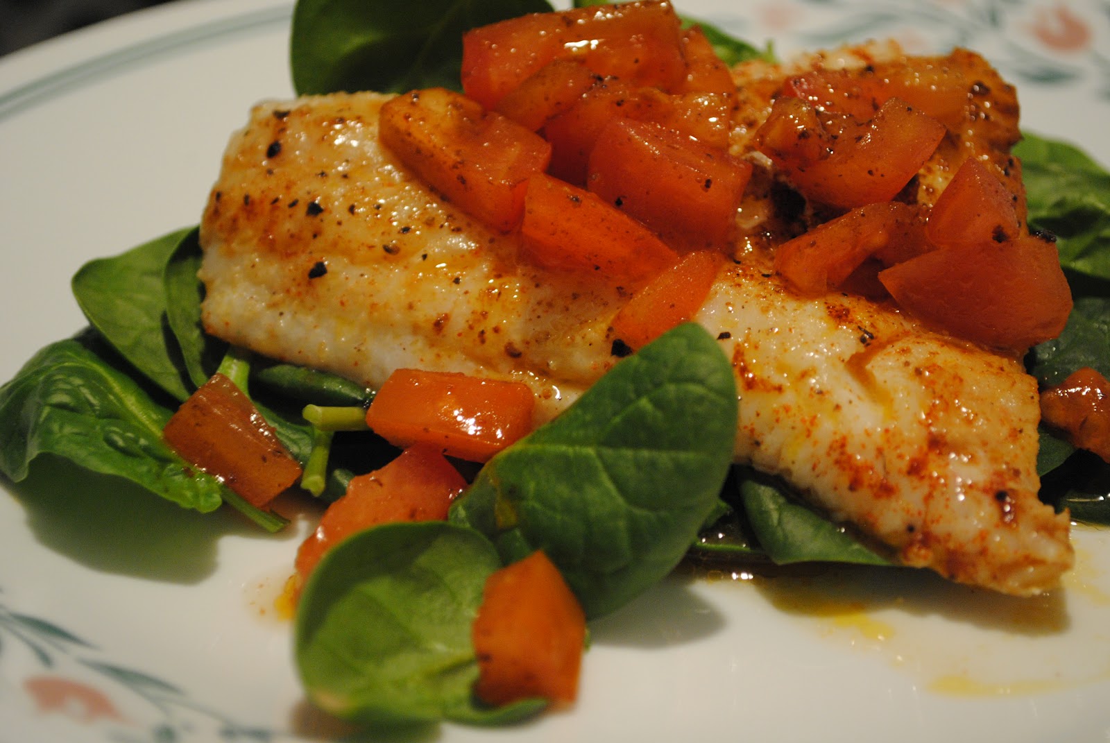 As soon as I took the fish from the pan I put it on a a bed of baby spinach. The butter, lemon, olive oil and tomatoes from the pan acted as a nice dressing.